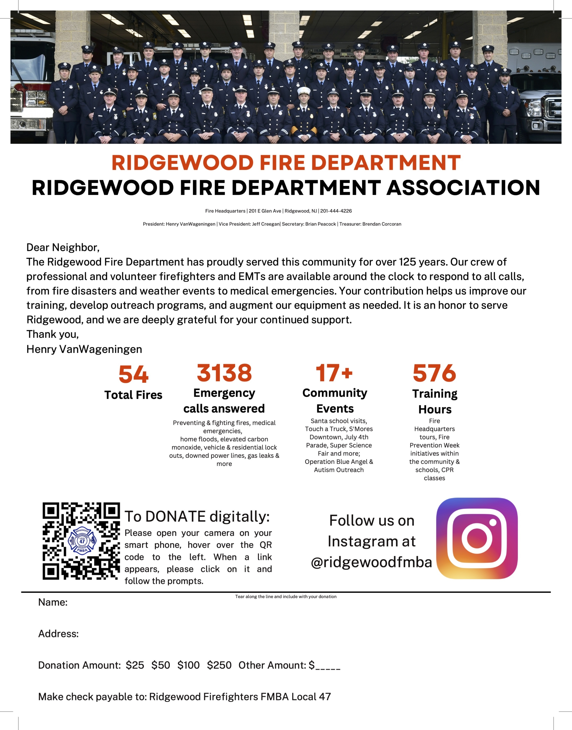 Our Mission is to protect the lives and property of all residents and visitors of the Village of Ridgewood. This shall be accomplished through fire suppression, fire prevention, public education, emergency medical services and the extensive pool of resources available to the Village to mitigate disasters either natural or manmade. We are committed to protecting the safety and well-being of our firefighters as we strive to make Ridgewood a safer place to live, work and visit.